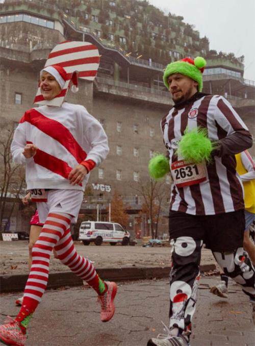天空低矮阴沉,灰色的雾笼罩着远处的高塔。清晨,汉堡市圣保罗(St.Pauli)的房子和绿化带在刺骨的寒冷中静静地矗立着,连同街对面游乐场的巨型摩天轮,以沉睡的姿态展示着冬季的困倦。 在不远处的米勒恩托尔体育馆(Millerntor-Stadions),呈现出截然不同的景象。将近五千名穿着圣诞风格服饰的跑者在体育馆外的半圆形拱门前等待比赛的开始。他们的装扮五彩缤纷,圣诞老人,精灵和驯鹿,小丑和天使