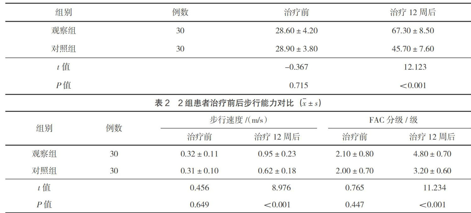【摘要】目的探讨功能性电刺激(functionalelectricalstimulation,FES)疗法对脑卒中患者下肢运动功能恢复的效果,为临床康复治疗提供科学依据。方法选取2024年1月—2025年1月鄱阳县人民医院接收的60例脑卒中患者作为研究对象,采用随机数字表法分为对照组和观察组,各30例。对照组接受常规康复干预,观察组在对照组基础上增加FES疗法,2组患者均治疗12周,比较2组患者治疗前后下肢运动功能、步行能力、平衡功能。结果治疗12周后,观察组Fugl-Meyer下肢运动功能评分量表(fugl-meyerassessmentof lowerextremity,FMA)评分为( (67.30±8.50) 分,显著高于对照组的 (45.70±7.60) 分0 ?P<0.05) 。观察组步行速度为 0.95±0.23, )m/s,功能性步行能力量表(functionalambulationclassification,FAC)分级为0 4.80±0.70, )级,均显著优于对照组的( 0.62±0.18) m/s和( 3.20±0.60) 级( P<0.05) 。观察组Berg平衡量表(bergbalance scale,BBS)评分为( 48.60±5.20, )分,高于对照组的 (42.30±4.70) 分( P<0.05) 。结论FES疗法联合常规康复训练能显著改善脑卒中患者下肢运动功能、步行能力和平衡功能,促进神经功能重组与恢复,是一种安全有效的康复手段,可于临床推广应用。
