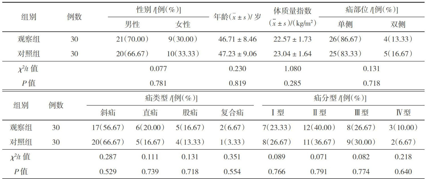 【摘要】目的探讨腹腔镜下腹股沟斜疝无张力修补术(tension-free hernioplasty,TAPP)中内环口关闭技术的临床应用效果。方法选择2024年1月—2025年3月吉安市第一人民医院收治的60例腹股沟斜疝患者作为研究对象,根据干预手段的不同分为对照组和观察组,各30例。对照组采用TAPP治疗,观察组采用TAPP中内环口关闭技术治疗,对比2组患者的临床疗效、围术期指标、术后并发症发生情况和疼痛程度。结果观察组的临床治疗总有效率为 96.67% ,高于对照组的 76.67% ( P< 0.05);观察组的住院时间短于对照组,术后下床活动时间早于对照组,术中出血量少于对照组( P<0.05) ;2组患者并发症发生情况比较,差异无统计学意义 (P>0.05) ;观察组术后视觉模拟评定量表(visualanalogue Scale,VAS)评分低于对照组( P< 0.05)。结论TAPP中内环口关闭技术的临床疗效确切,在不增加并发症发生率的前提下改善患者各项临床指标,缓解患者术后疼痛。