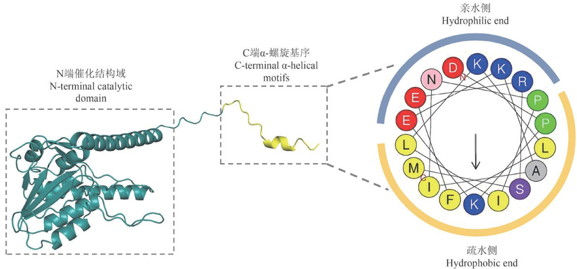 摘要:维氏气单胞菌(Aeromonas veronii)是水产动物养殖中常见革兰氏阴性病原菌,由于其自身产生的细胞外膜具有一定的屏蔽作用,导致多种抗生素和抗菌制剂难以将其杀灭。经生物信息学分析,从噬菌体数据库中筛选到1条革兰氏阴性细菌噬菌体裂解酶的氨基酸序列,具有该酶所特有的N端催化结构域和C端两亲性∝ 螺旋结构基序。为鉴定该氨基酸序列是否具有抑菌活性,将其编码基因按照酵母密码子优化并进行人工合成,转化至毕赤酵母GS115中进行组成型分泌表达,获得了重组维氏气单胞菌噬菌体裂解酶(LYS2),分泌表达量为 140mg-L-1 。LYS2对维氏气单胞菌 Hm091 具有显著的抑菌活性,体外最小抑菌浓度为 3μg?mL-1 ;体外最适抑菌条件为 42°C,pH4~10 ;在 4~50°C 和 pH4~7 条件下可保持活性稳定;对鱼类消化道常见金属离子和蛋白酶表现出良好的耐受性。研究结果为水产动物养殖过程中维氏气单胞菌的预防与治疗提供了一种新的具有应用潜力的抗菌蛋白,为该抗菌蛋白的生产和应用奠定了理论基础和技术支撑。