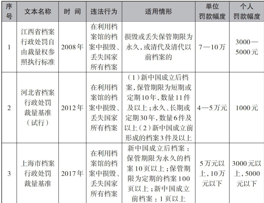 摘要:档案行政处罚裁量要素的选择直接决定裁量基准质量,进而从根源上影响档案行政执法的公平、公正与效率,是档案主管部门内部控权规范的核心内容。其演进历程清晰呈现阶段性特征:1999年《中华人民共和国档案法实施办法》确立“档案价值 .+ 数量”的裁量基础,后经实践转化为“档案保管期限 + 数量”的二元裁量要素模式;随着档案行政执法实践深化,二元模式的局限性逐渐凸显,部分档案主管部门引入违法动机、违法后果等要素以弥补不足;2021年新修订《中华人民共和国档案法》实施后,裁量要素进一步拓展,正式形成多元裁量要素共存的新格局。档案行政处罚裁量要素从二元到多元的演进,不仅标志着档案行政处罚裁量基准自身朝着规范化、科学化方向持续完善,本质上更是我国档案治理体系迈向现代化的生动写照。