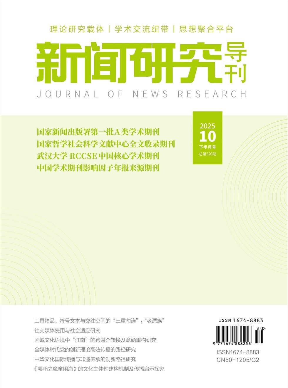 《新闻研究导刊》创刊于2010年,是由重庆日报报业集团主管、主办的新闻传媒类专业学术期刊。 主要刊发新闻传媒、创意设计等相关领域学术论文,及时报道全国乃至世界传媒行业的热点话题、焦点事件中挖掘提炼对传媒界有借鉴作用和启发意义的新理念、新思想和新理论,总结提升媒体采编和经营实践的新做法、新探索和新趋势。本刊以传媒业界与学界的结合点,传媒理论与实践的引领点,传媒今天与明天的制高点为办刊理念,立足重庆,面向全国,集学术性、理论性、实用性、知识性、可读性于一体,是新闻传媒大中专院校教师硕博研究生、新闻工作者、新闻研究者、新闻爱好者的"良师益友"。