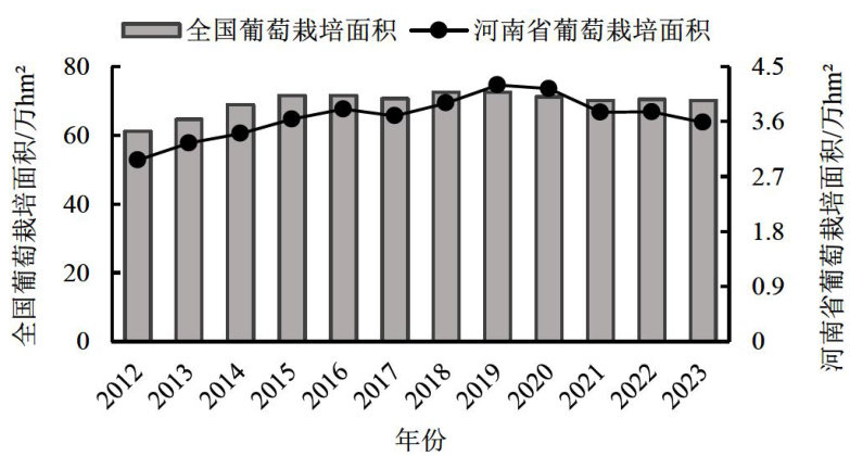 摘要:河南省是我国鲜食葡萄种植大省和主产区之一,近年来全省葡萄的种植面积和产量稳步上升,种植面积约 3.53Thm2 ,占全省水果面积的 9.27% ,年产量约91万t,居全国第5位。本文论述了河南省葡萄种植生产情况、产区分布、品种结构等产业现状,结合政府相关政策及实地调研成果,分析了河南省葡萄产业发展存在的问题,提出了发展建议,旨在为促进河南省葡萄产业高质量发展提供参考依据。