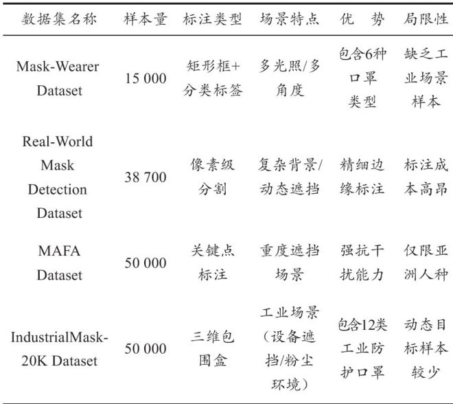 摘要:在工业生产及特定高风险场所,规范佩戴口罩是保障人员安全与健康、维持生产合规性的关键环节。传统人工监督方式存在效率低、覆盖面有限且易受主观因素影响等局限性。文中系统研究了该领域的核心模型与应用技术,重点分析了卷积神经网络(CNN)、YOLOv5和MobileNetV2三种模型的性能特点。研究涵盖数据集构建、预处理方法、检测流程设计及模型评估体系,并通过对比实验验证各模型在复杂工业环境中的表现。实验结果表明,YOLOv5在速度与精度间取得最佳平衡, F1 分数达 97.6% ,检测速度为 45f/s ,适合工业实时检测场景;MobileNetV2则以低计算开销(1.3GFLOPs)和小模型体积( τ14MB )实现62f/s高效推理,适用于移动端部署。该研究为智能口罩检测技术的实际应用提供了理论支持与技术参考。