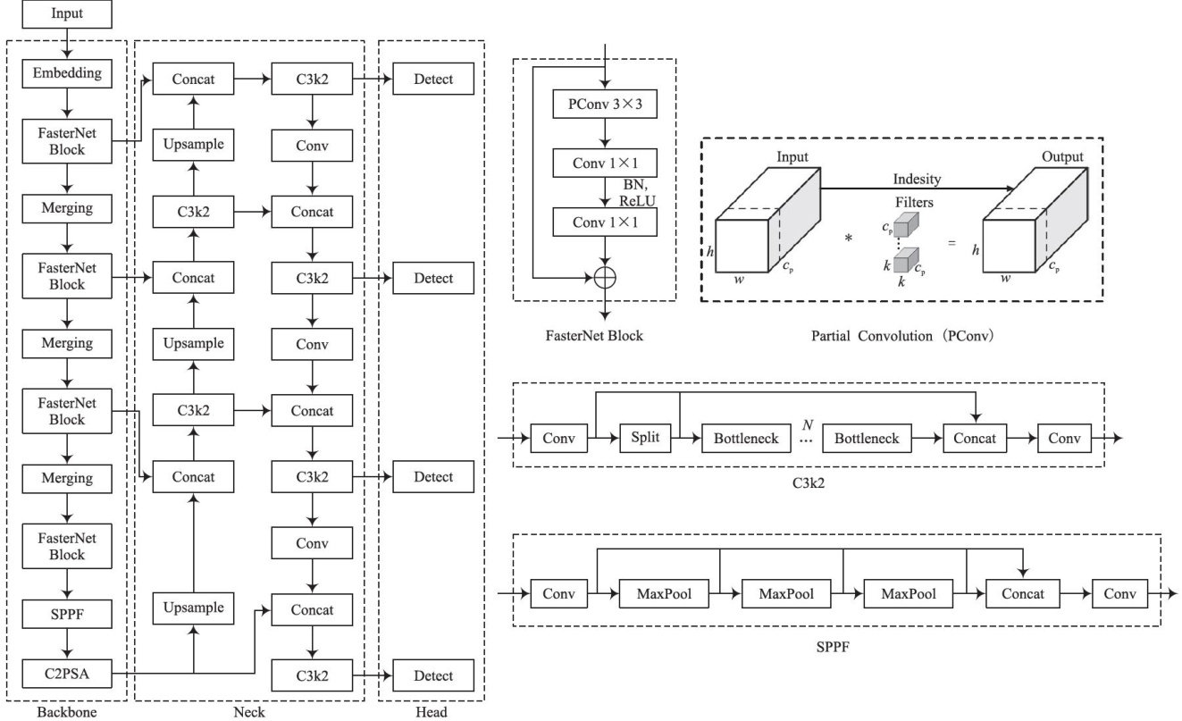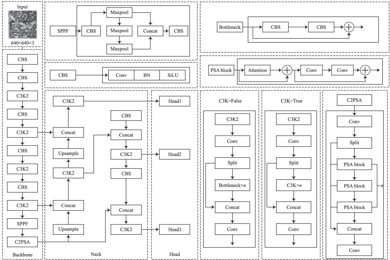 摘要:针对温室番茄幼苗检测中背景干扰复杂、小目标密集及多尺度适应性不足等问题,提出基于YOLOvlln的三阶段优化算法。首先,引入RepViT主干网络,利用结构重参数化技术优化多尺度特征融合,在保证精度的同时降低计算复杂度;其次,设计多尺度动态注意力(MSDA)模块,通过通道解耦与空间注意力增强特征表达能力;最后,构建基于双向特征金字塔网络(Bi-FPN)的颈部结构,采用双向跨尺度连接提升多尺度特征融合效果。实验结果表明,改进模型在自建数据集上的mAP达 98.0% ,较传统YOLOv1ln提升 1.6% ,参数量和计算量分别降至 2.003×106 和5.9GFLOPs,分别减少 22.5% 和 6.3% 。对比YOLOv5\~YOLO10系列,该算法在保持最低计算量的同时,mAP平均提升 2.3% ,精确率和召回率达 96.8% 和 94.7% 。该模型通过精度与效率的协同优化,为农业自动化监测提供了兼具轻量化与高精度的解决方案。