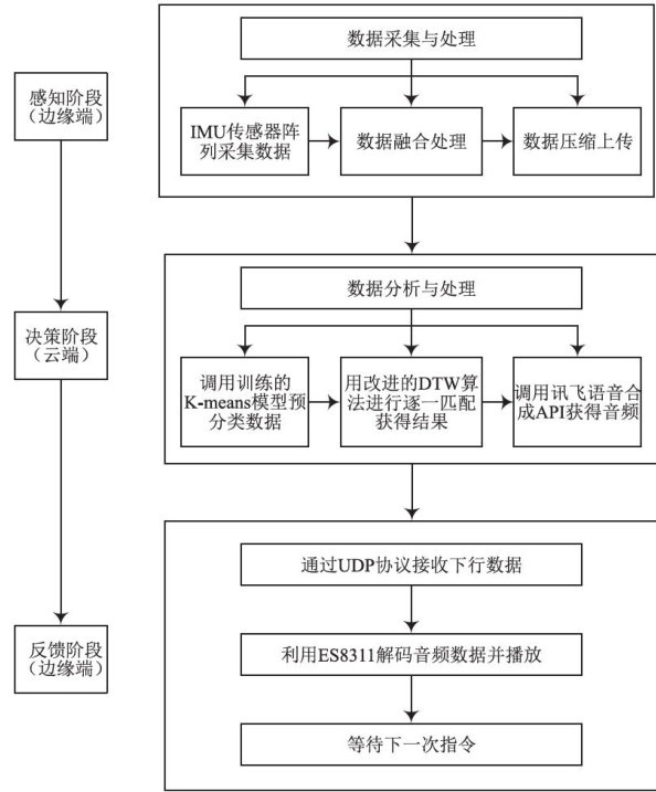 摘要:针对现有手语识别技术中存在的环境敏感性强、计算延迟高及穿戴舒适性不足的问题,文中提出了一种基于多传感器融合与边缘-云端协同的实时手语翻译系统。通过分布式IMU阵列与仿生机械结构设计,实现了手部16关节六自由度运动的高精度捕捉。系统采用ESP32-S3双核处理器进行四元数解算与动态滤波,显著降低了数据传输量。云端部署分层识别架构,结合K-means预分类与带约束的DTW算法,提升了识别效率。实验结果表明,系统在多种环境下表现出良好的鲁棒性和实时性,为聋哑人通信提供了低成本解决方案,并可拓展至医疗康复、工业控制等领域。